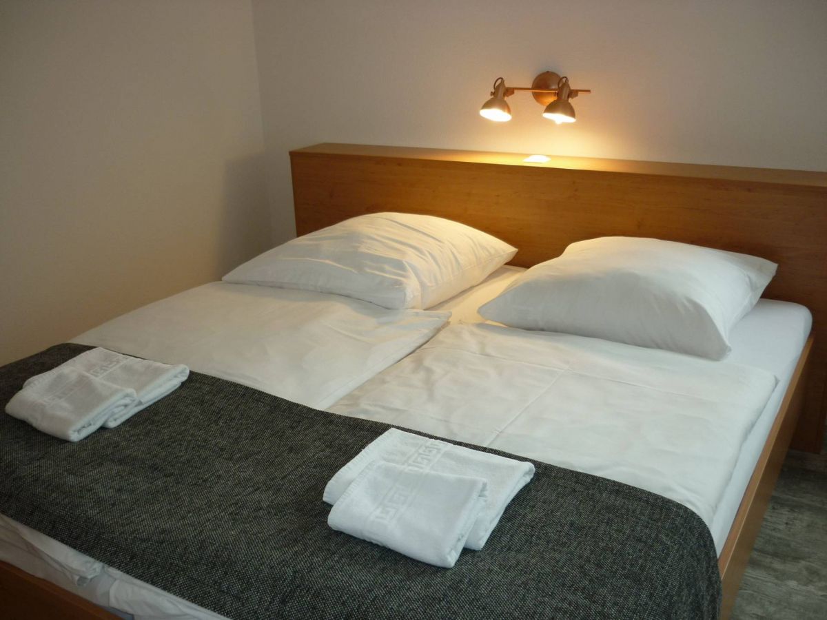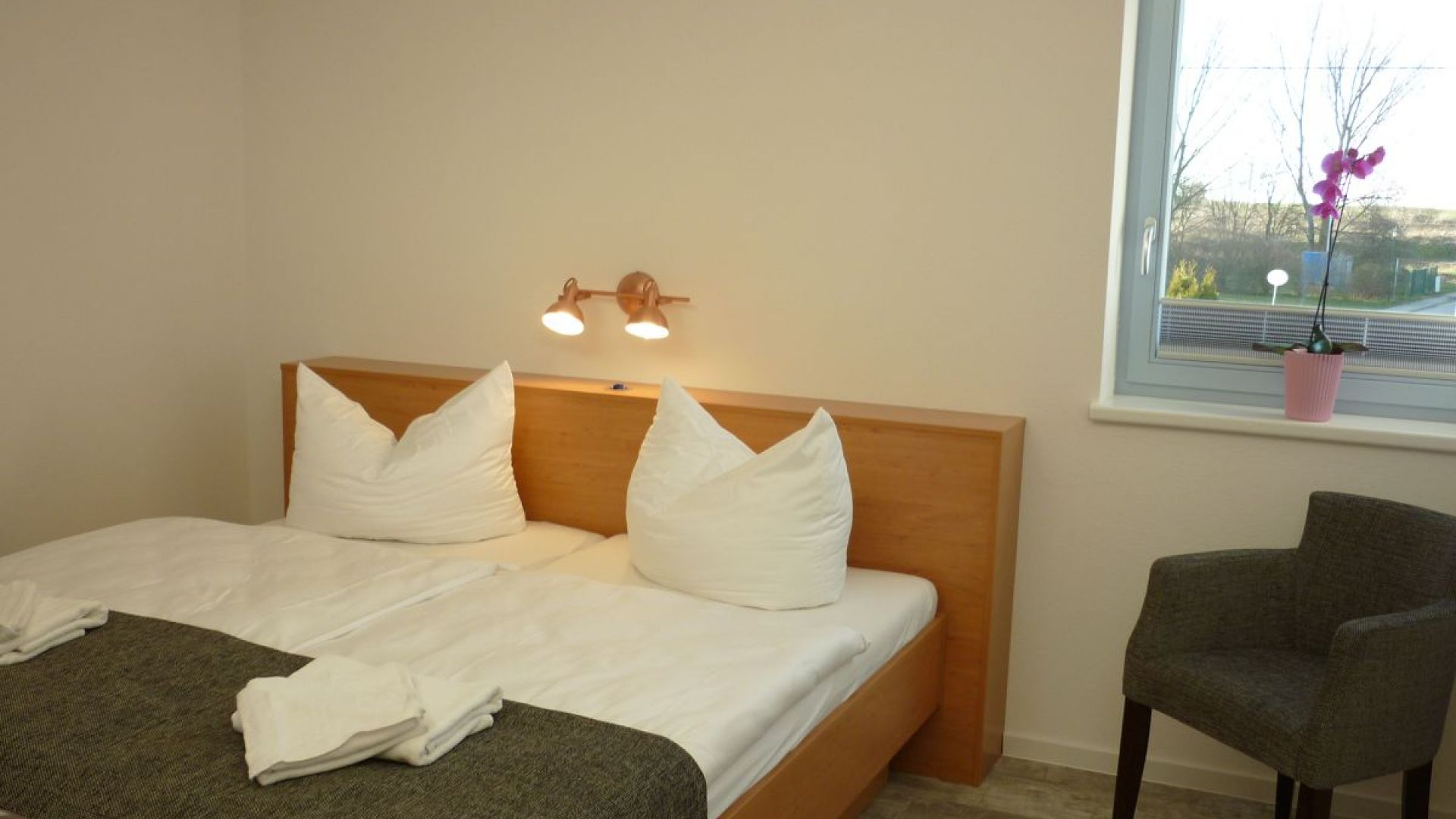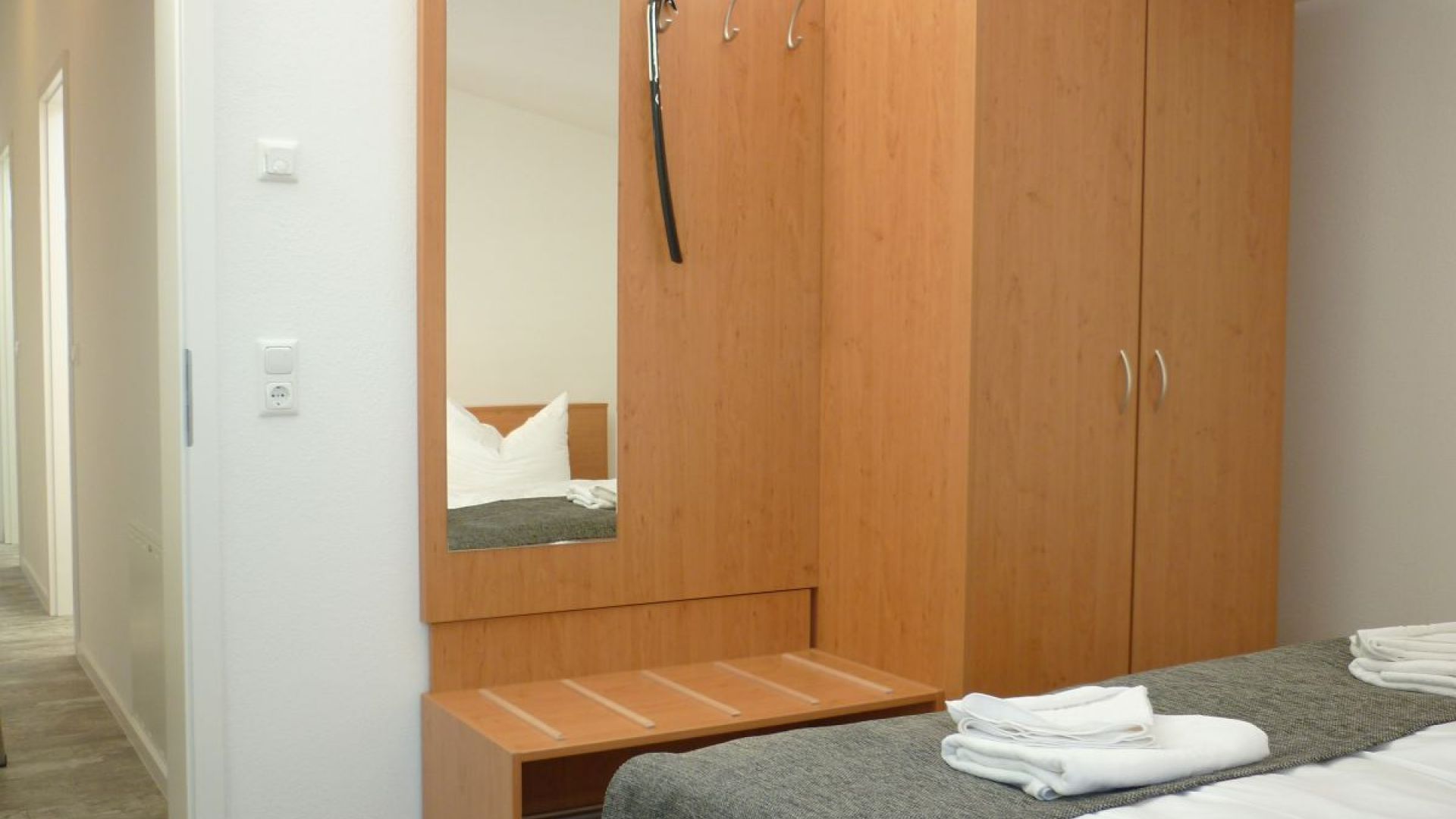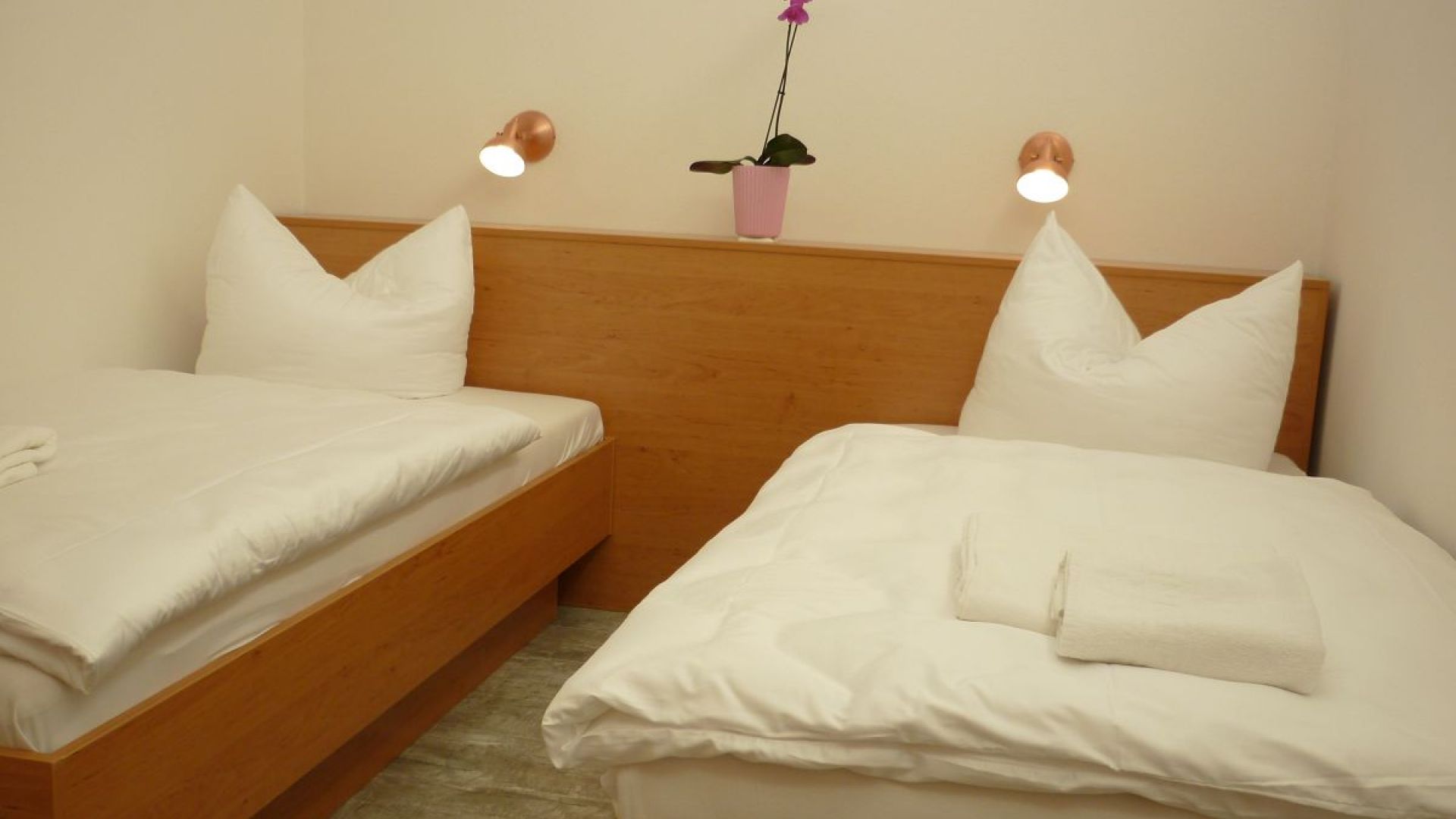 Schlafzimmer mit Doppelbett und Zweierbetten.