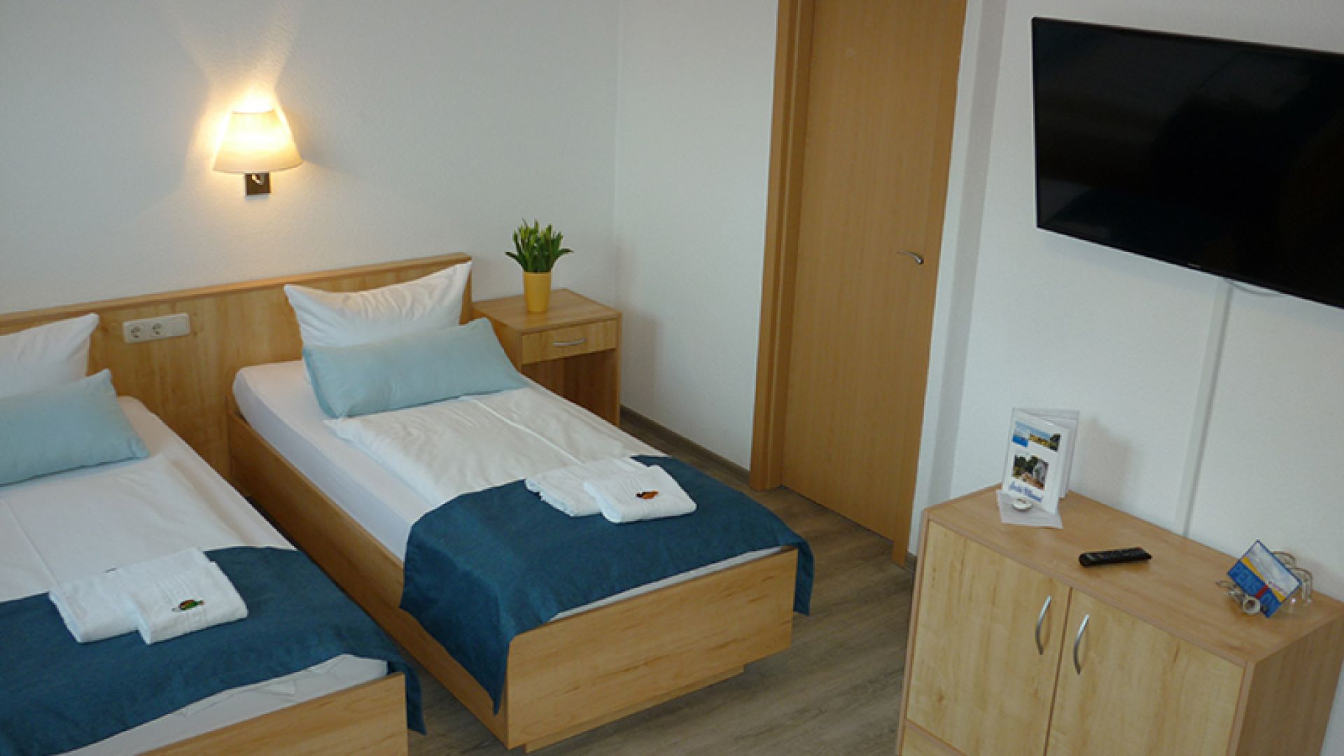 Zwei Betten zusammenstellbar (mit Sommer.- und Wintermatratze, Kopf.- und Fußende verstellbar), Sitzgelegenheit mit Tisch, großer Schrank, Garderobe, Nachtschrank, TV und Duschbad, geräumig.