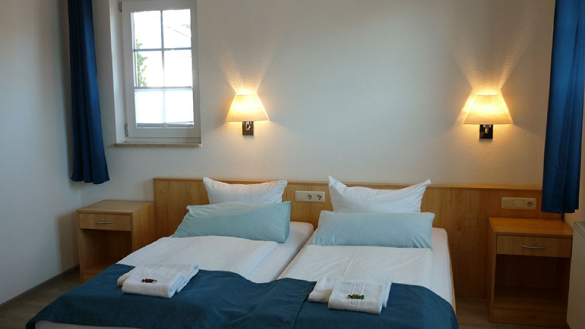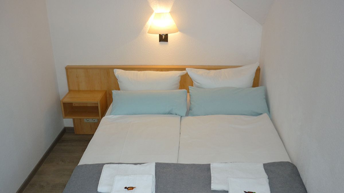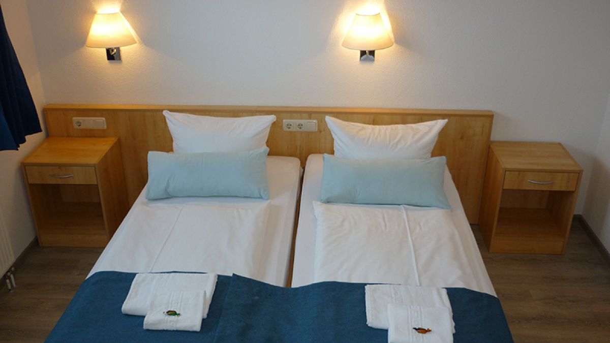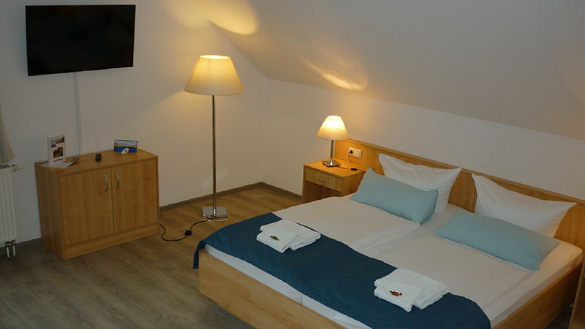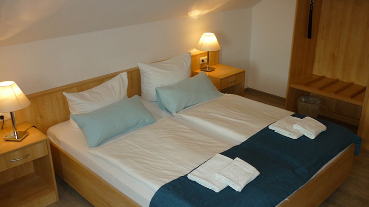 Bett (mit Sommer.- und Wintermatratze, Kopf.- und Fußende anstellbar), Sitzgelegenheit mit Tisch, großer Schrank, Garderobe, Nachtschrank und ausreichend Licht, TV und Duschbad, teilweise Balkon.