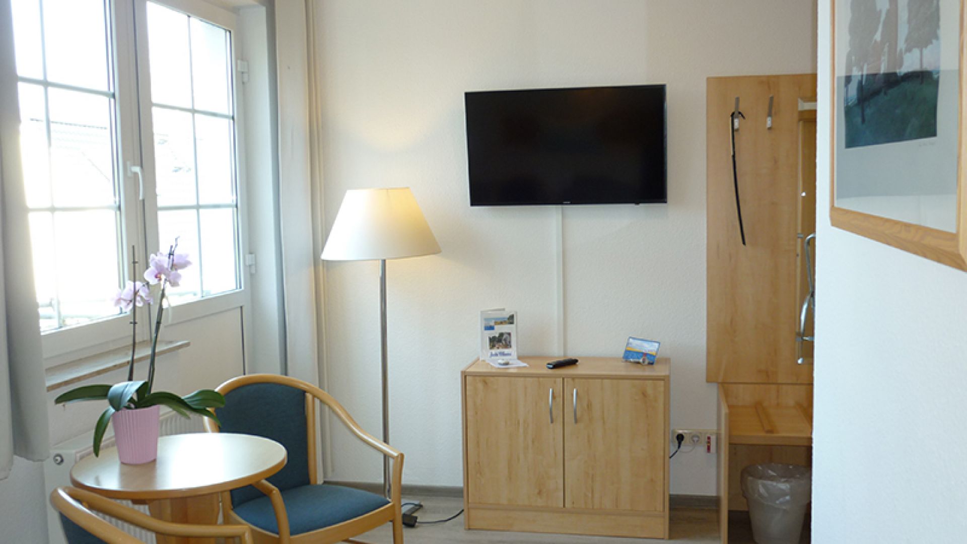 Bett (mit Sommer.- und Wintermatratze, Kopf.- und Fußende anstellbar), Sitzgelegenheit mit Tisch, großer Schrank, Garderobe, Nachtschrank und ausreichend Licht, Balkon, TV und Duschbad