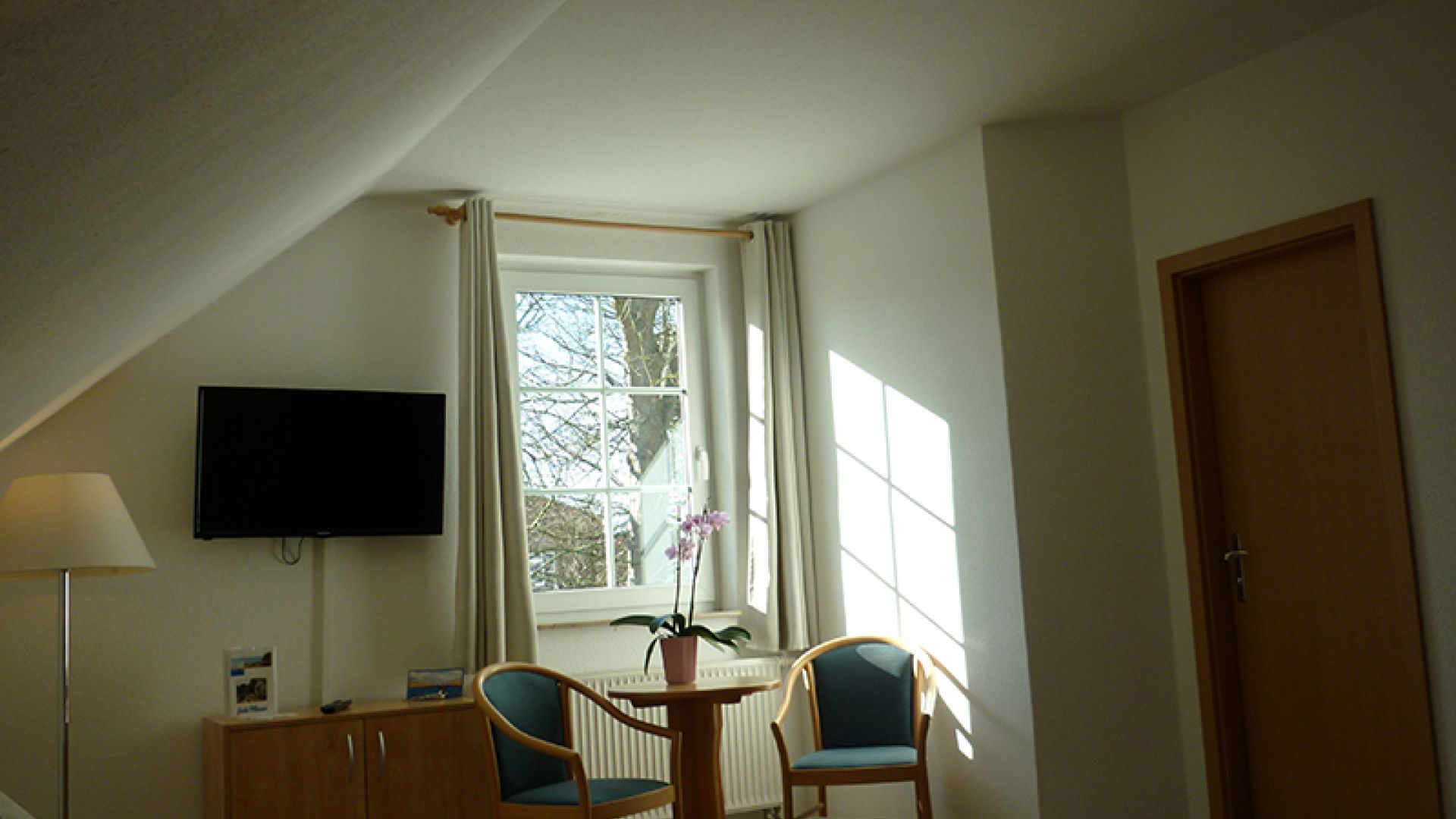 Bett (mit Sommer.- und Wintermatratze, Kopf.- und Fußende anstellbar), Sitzgelegenheit mit Tisch, großer Schrank, Garderobe, Nachtschrank und ausreichend Licht, TV und Duschbad, teilweise Balkon.